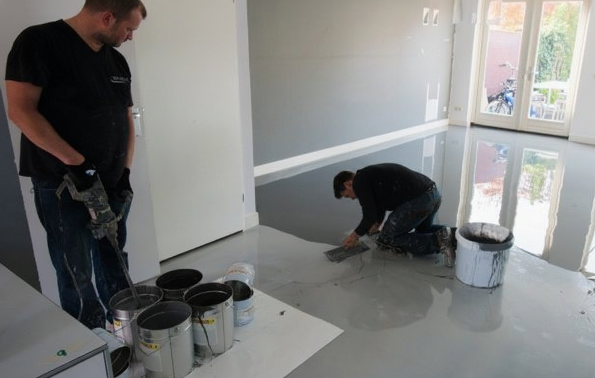 Vakkundige opbouw, applicatie van de gietvloer en zorgvuldige afwerking.